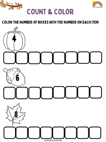 Color the Boxes: Color in the number of boxes that matches the number for each picture.